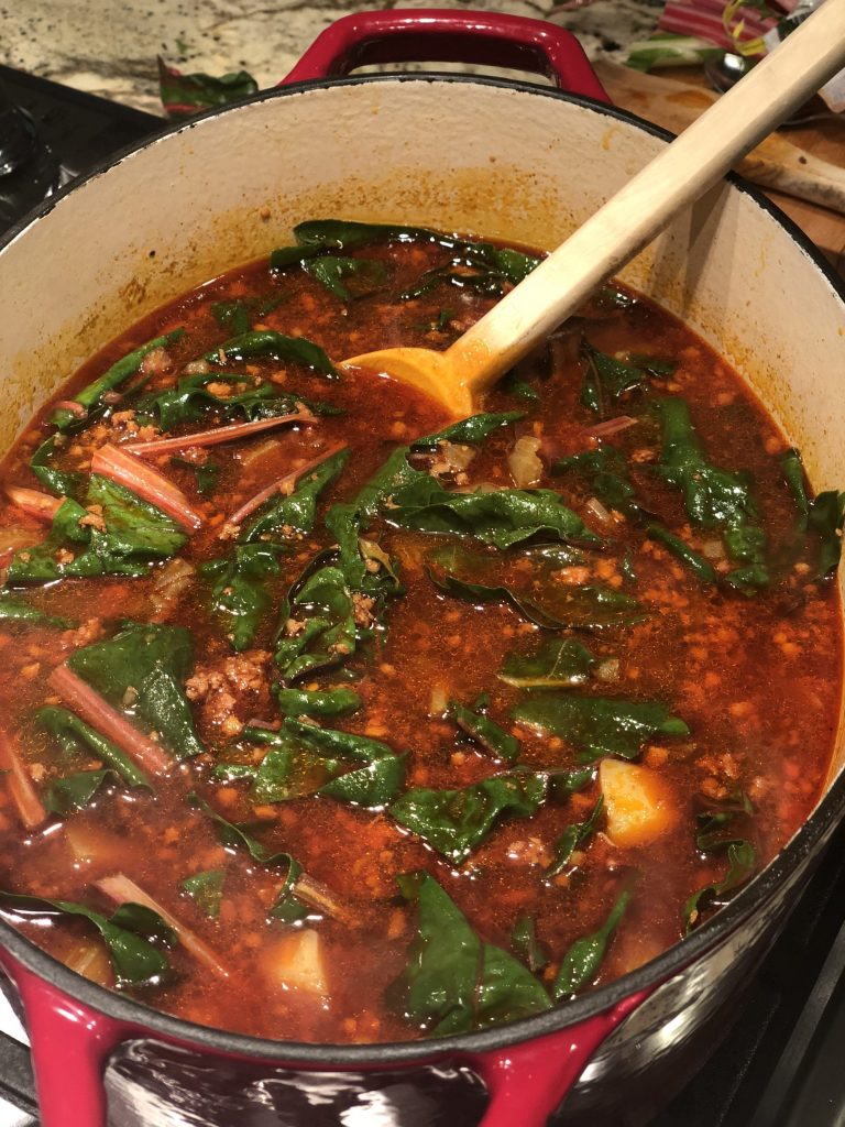 - Add the chopped Swiss chard leaves (or spinach) to the pot.