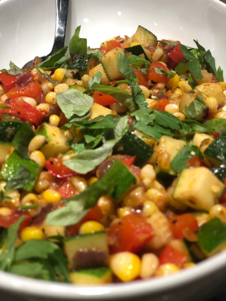 Technically, this is not a traditional succotash, but it’s darn close, and I don’t know what else to call it. Succotash is typically defined as a cooked dish of corn kernels mixed with shell beans, especially lima beans, and often with green and sweet red peppers. While this recipe omits the lima beans, it brings together corn, peppers, and other fresh veggies for a dish that tastes like a summer breeze and might make you feel fine…