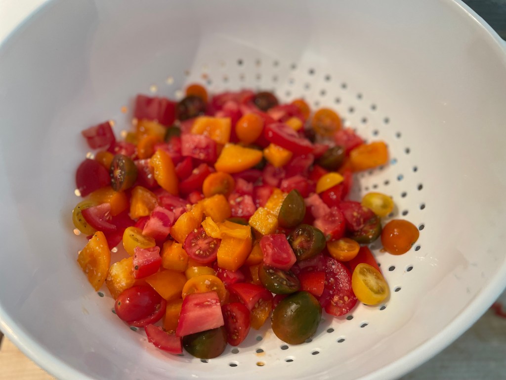 Place chopped tomatoes in a colander set over a bowl. Sprinkle with 1 tsp salt and let them sit for 15–20 minutes. This draws out excess liquid while intensifying flavor. Reserve the tomato juices for the vinaigrette. - Make the Vinaigrette: